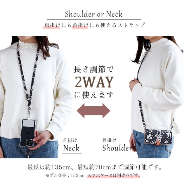 両側にナスカン留めが付いていてショルダーストラップとしてお使いいただける他、ナス菅とストラップ本体に付いているリングを組み合わせることでネックストラップとしてお使いいただけます。