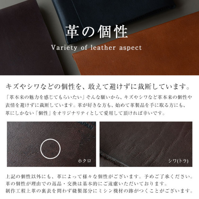 一枚の革を大きく使用していますのでナチュラルスタンプと呼ばれる傷やシワ、などが入っていることもありますが、それこそが世界に一つしかない一点物としての魅力となっています。
