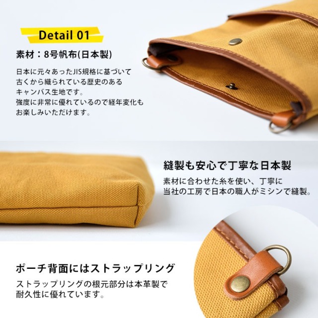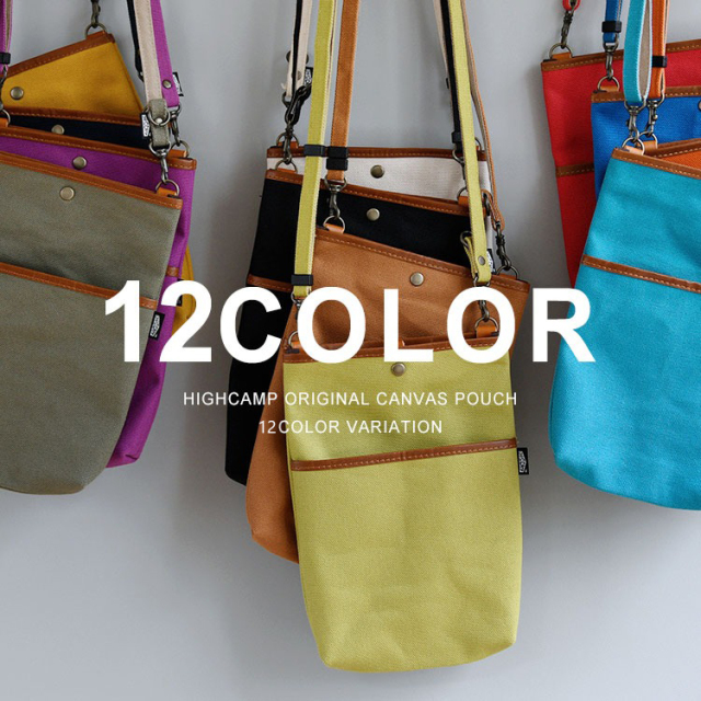 丈夫な日本製のキャンバス生地(8号帆布)を使用したハイキャンプオリジナルデザインのサコッシュポーチです。カラーも12色とバリエション豊富です。