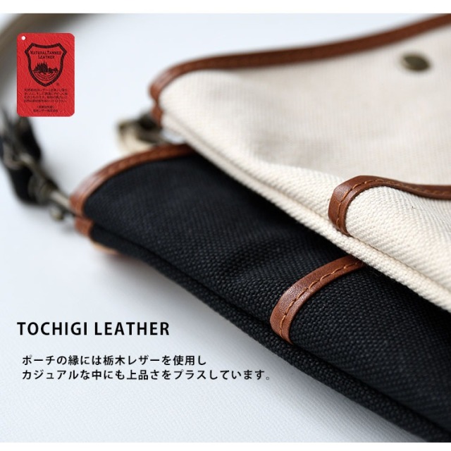 ポーチの縁には栃木レザーを使用しカジュアルな中にも上品さをプラスしています。