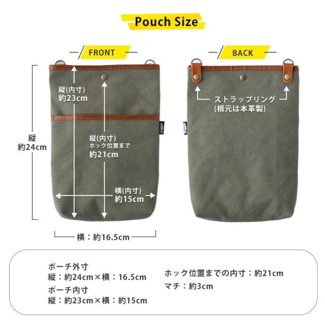 ポーチ外寸/縦:約24cm×横:約16.5cm ポーチ内寸/縦:約23cm×横:約15cm マチ:約3cm |