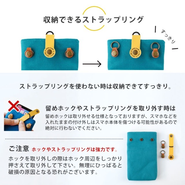 使うほどに生地が馴染んで柔らかく味わいが出て、強度・耐久性・ 通気性にも優れており、静電気も起きないスマホ入れ。ホックは取り外せるのでお洗濯も可能です。