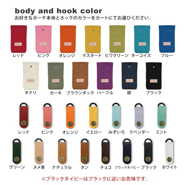 13色の本体と15色のホックからお好きな色を選んで自分好みのスマホポーチを作ることができます。