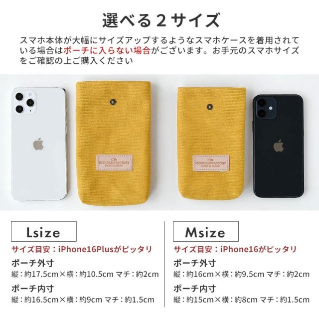 ポーチ本体 Mサイズ 外寸 縦:約16cm 横:約9.5cm マチ:約2cm 内寸 縦:約15cm 横:約8cm マチ:約1.5cm Lサイズ 外寸 縦:約17.5cm 横:約10.5cm マチ:約2cm 内寸 縦:約16.5cm 横:約9cm マチ:約1.5cm ※ハードケースや、TPUケースを装着した場合のサイズ目安となっております。 スマホ本体が大幅にサイズアップするようなスマホケースを着用されている場合はポーチに入らない場合がございます。 お手元のスマホサイズをご確認の上ご購入ください。 |