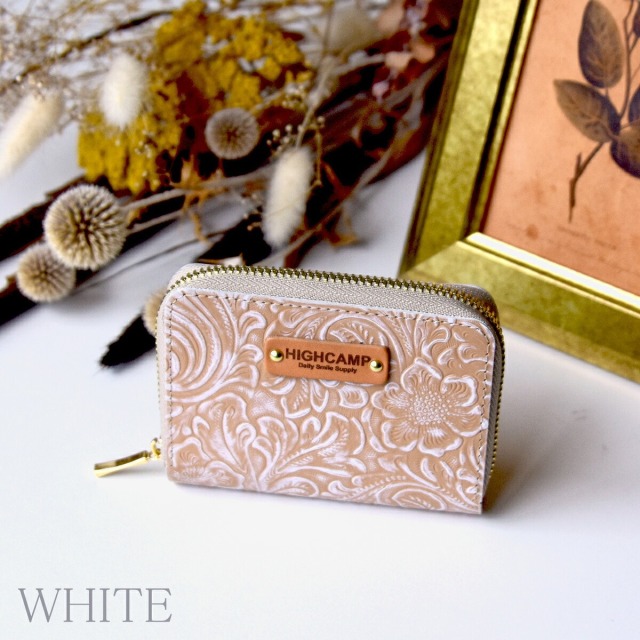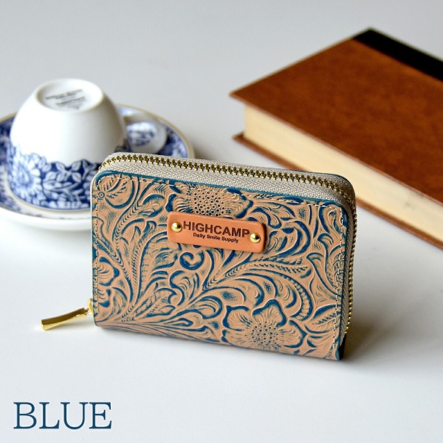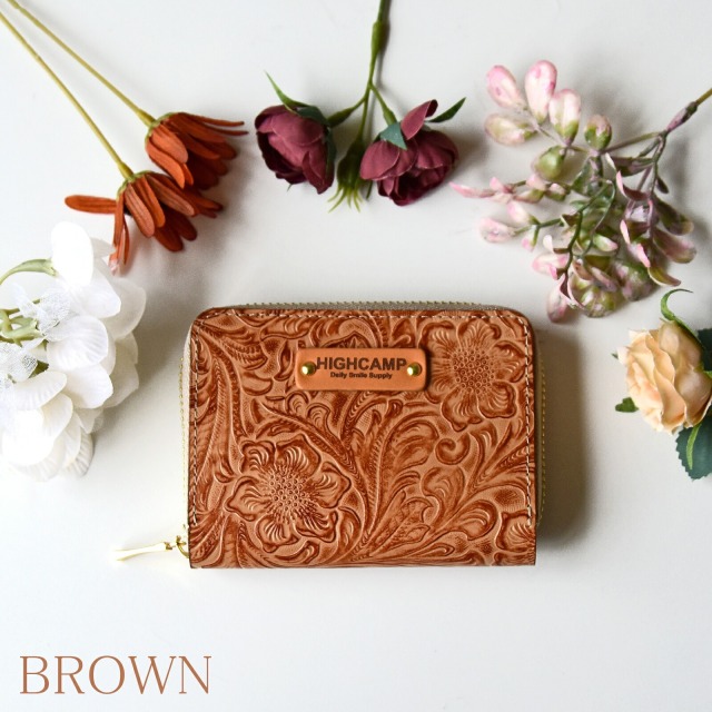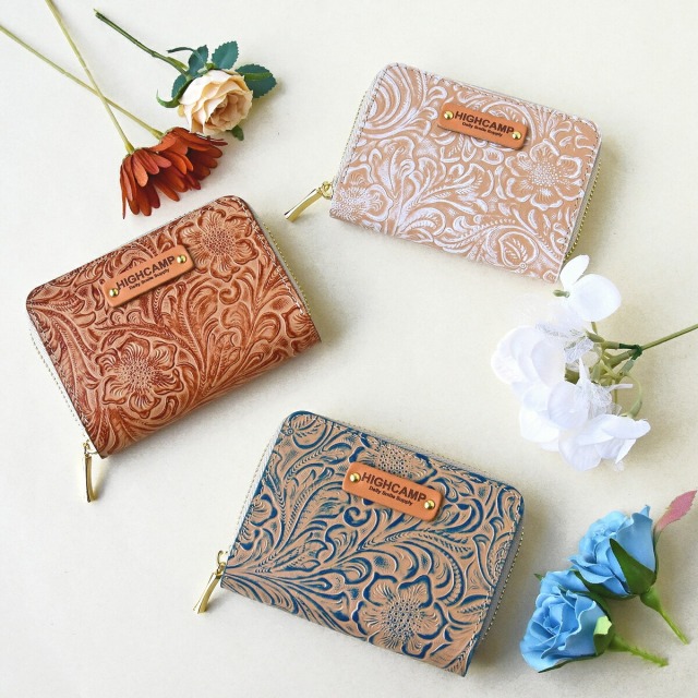 綺麗な花柄の型押しを施したカービングレザーのミニウォレットです。