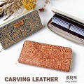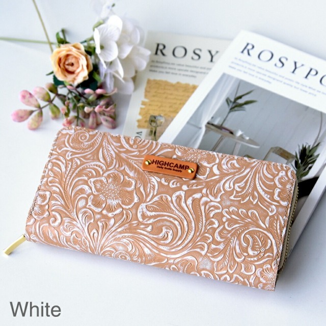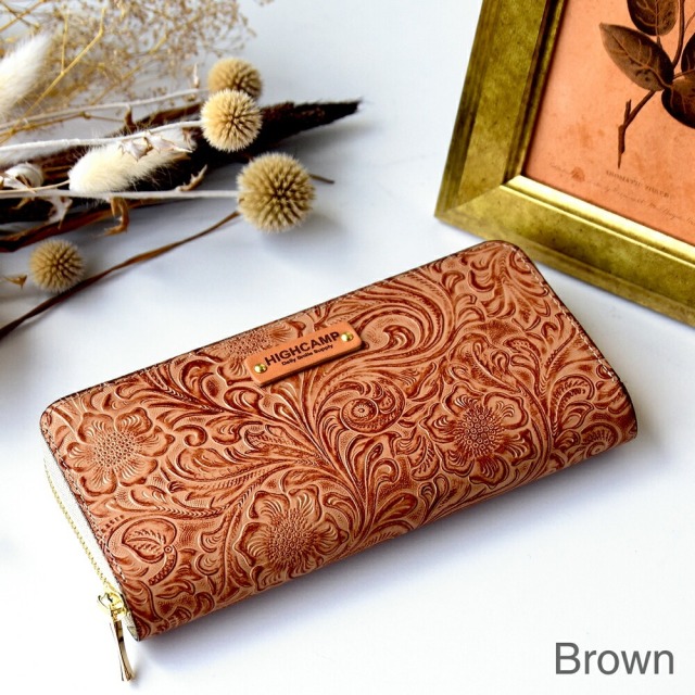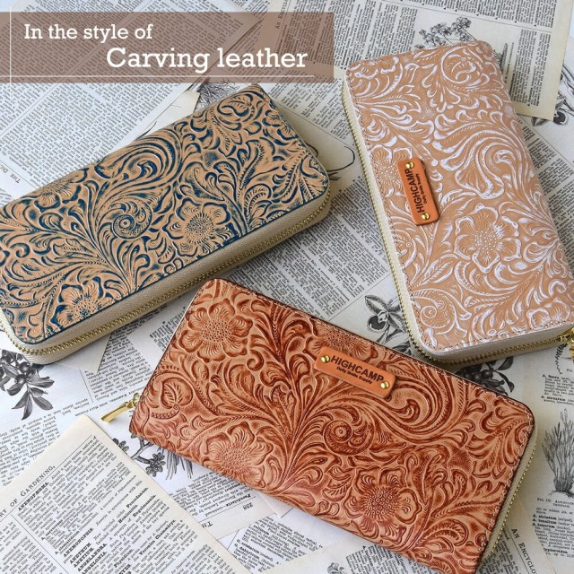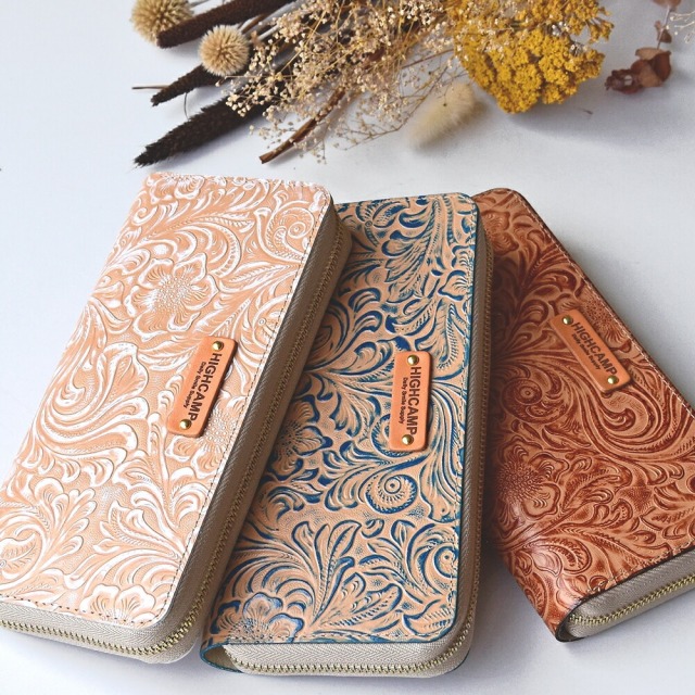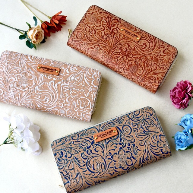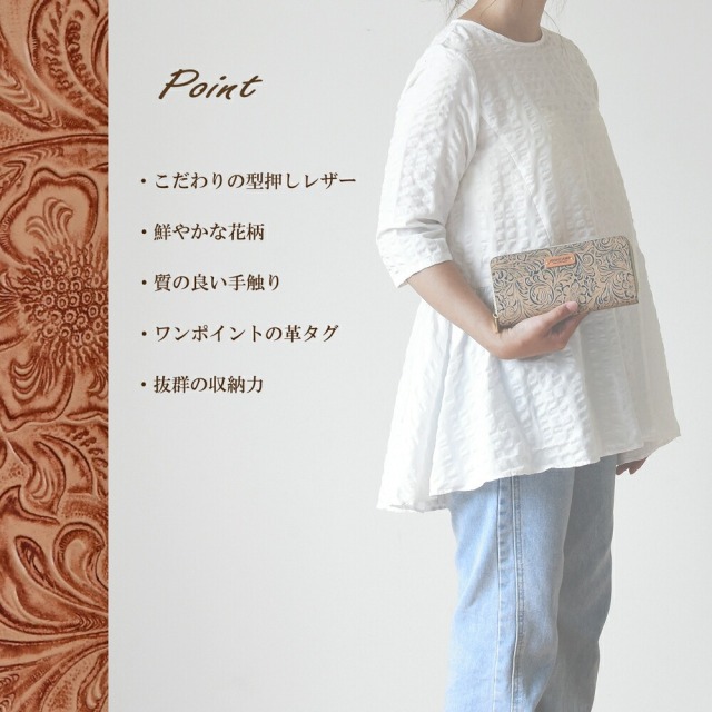 綺麗な花柄の型押しを施したカービングレザーのロングウォレットです。