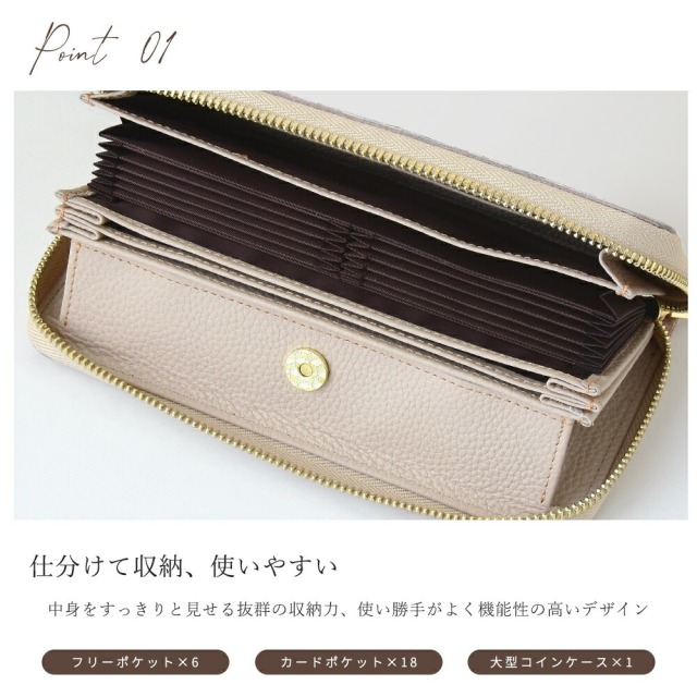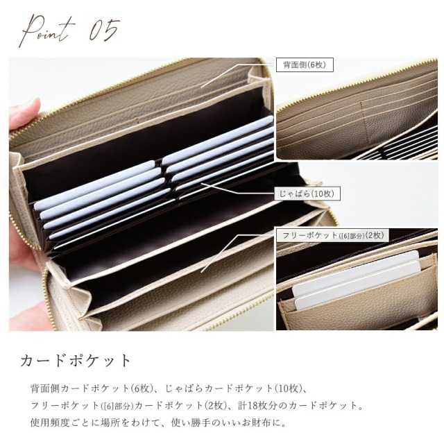 ・本革(カービングレザー) ・本革(姫路産シュリンクレザー) ・フリーポケット×6(お札・レシート・領収書等) ・カードポケット×18(欲しいカードがひと目で見つかるじゃばら式タイプ) ・大型コインケース×1(ボックス型コインケース) |