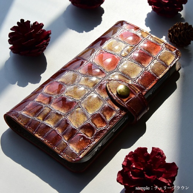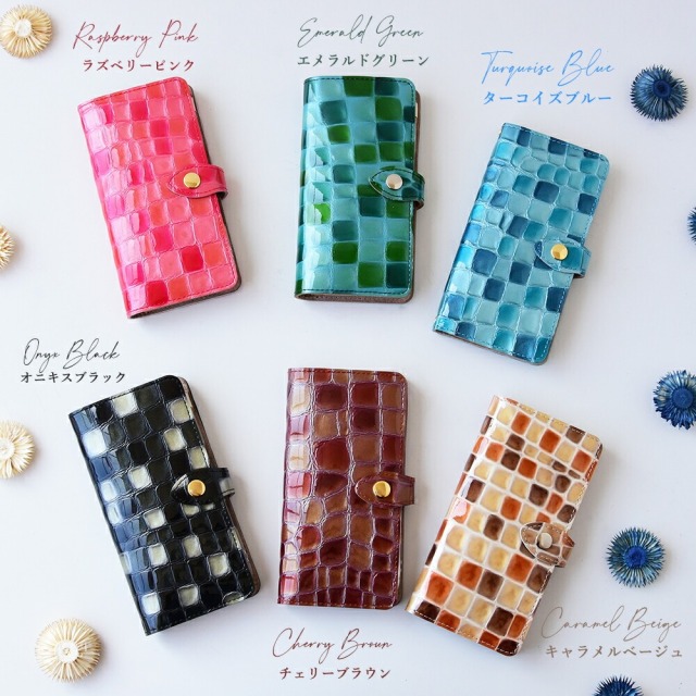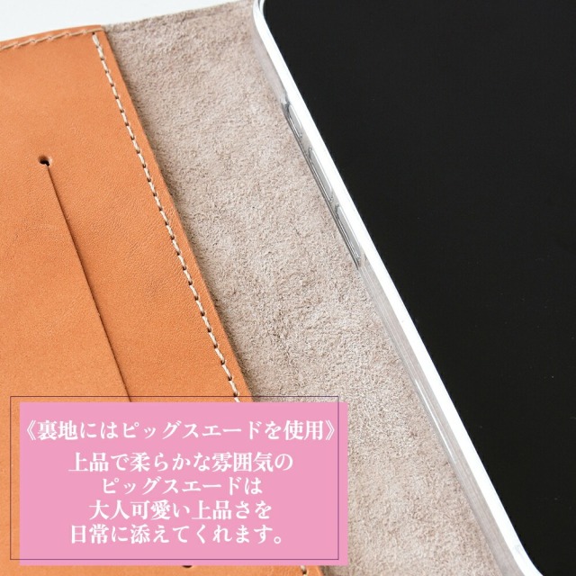 「エナメルステンドグラスレザー」と「ピッグスエード」「栃木レザー」を贅沢に組み合わせたほぼ全機種対応の手帳型スマホケースです。
