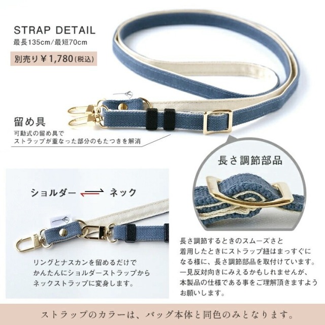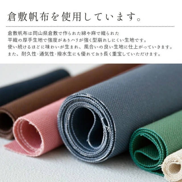 | 素材 | ・コットン(帆布)、ポリエステル、革(ヌメ革)、ナイロン(裏地) |
