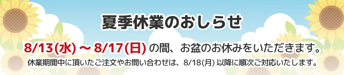 休業期間中のお問い合わせに関しましては、2025年8月18日(月)より順次ご対応いたします。